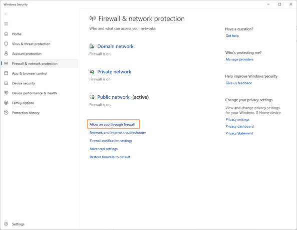 Settings⭢ Privacy & security ⭢ Windows Security ⭢ Firewall & Network Protection ⭢ Allow an app through the