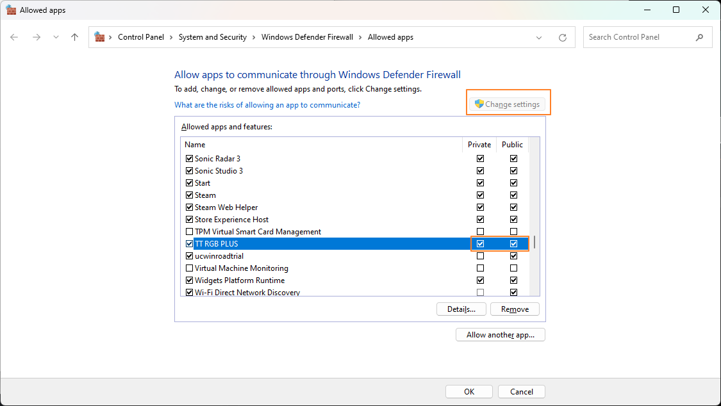 Follow the Windows settings path below to allow the TT RGB PLUS 3.0 software through the firewall: