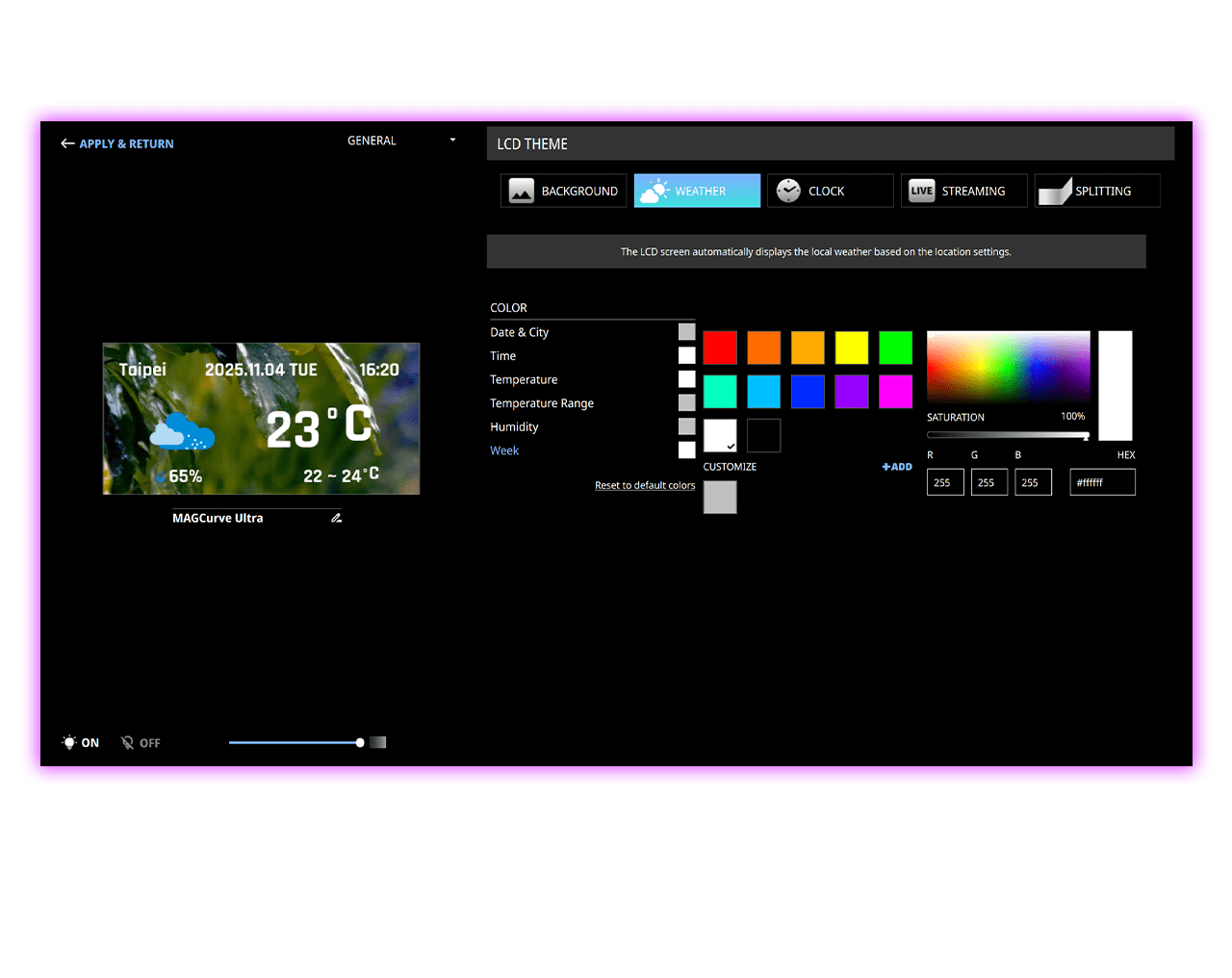 The MAGCurve 360 Ultra ARGB Sync is engineered to impress, featuring a stunning 6.67" curved AMOLED display. With the innovative AI Forge function, you can easily create personalized backgrounds. It is equipped with TOUGHFAN EX 120 ARGB Sync fans featuring a Swappable Fan Blade Design, providing flexible airflow direction. Its MagForce 2.0 Quick Magnetic Connections allow for effortless installation and superior cable management, ensuring excellent cooling performance while remaining visually striking.