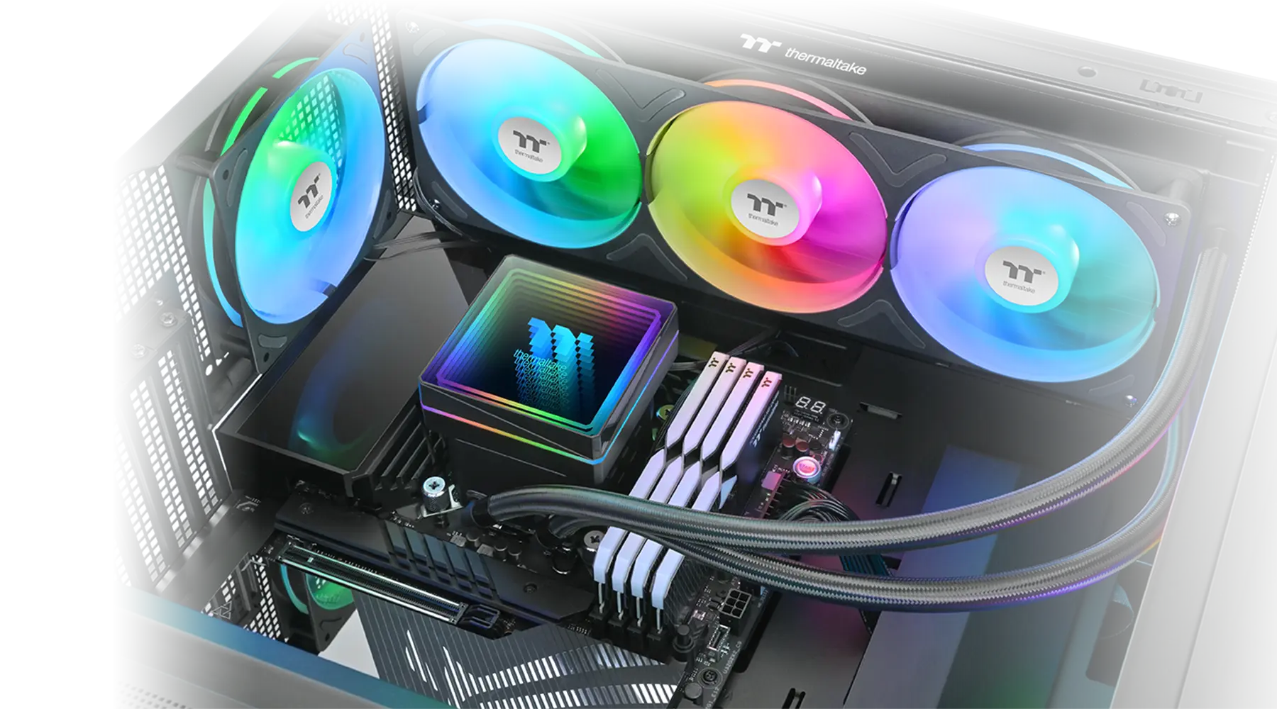 TH360 V3 ARGB Sync AIO Liquid Cooler has a powerful 360mm PWM fan module, a single-frame unit combining three 120 mm fans. Each fan provides an airflow of 85.29 CFM with 3.86 mm-H2O static pressure while maintaining a noise level of 37.8 dB-A, offering exceptional cooling performance for your system.