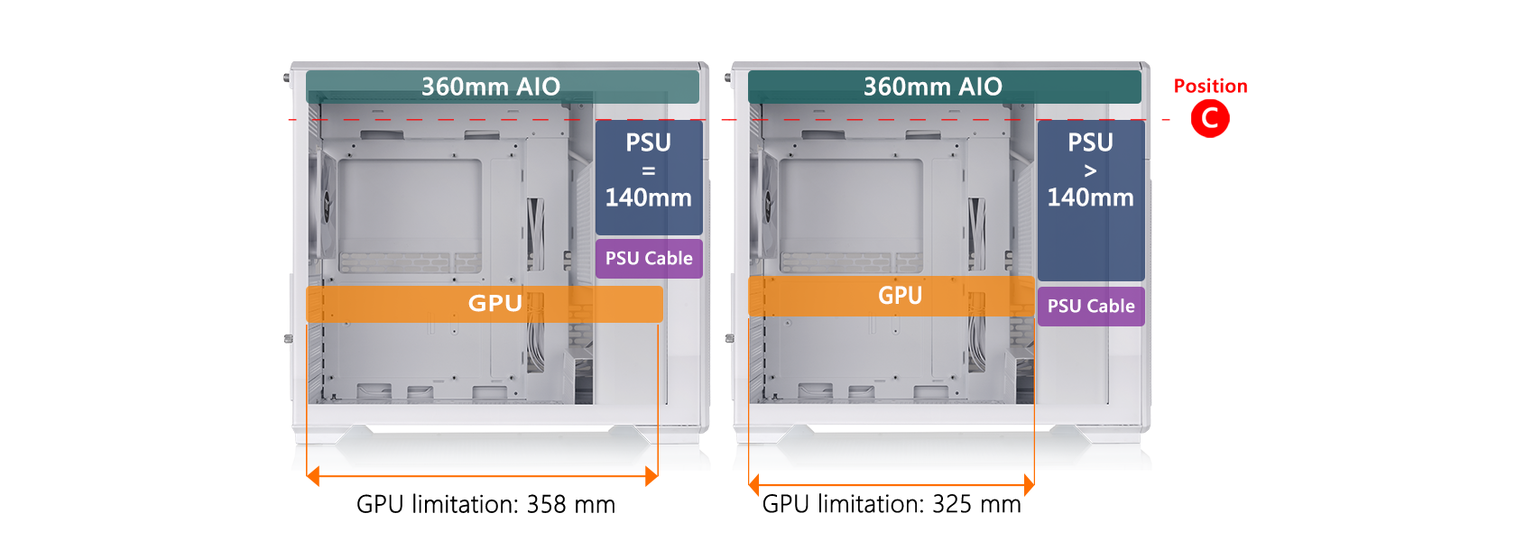 | Radiator Support | Top (AIO) : 1 x 360mm, 1 x 240mm, 1 x 120mm 1 x 280mm, 1 x 140mm Rear (AIO) : 1 x 120mm |