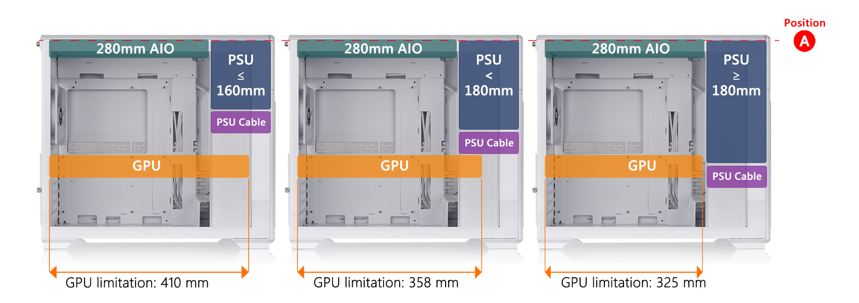 Top fan only supports two 120mm / 140mm fans only when PSU is installed in position A.