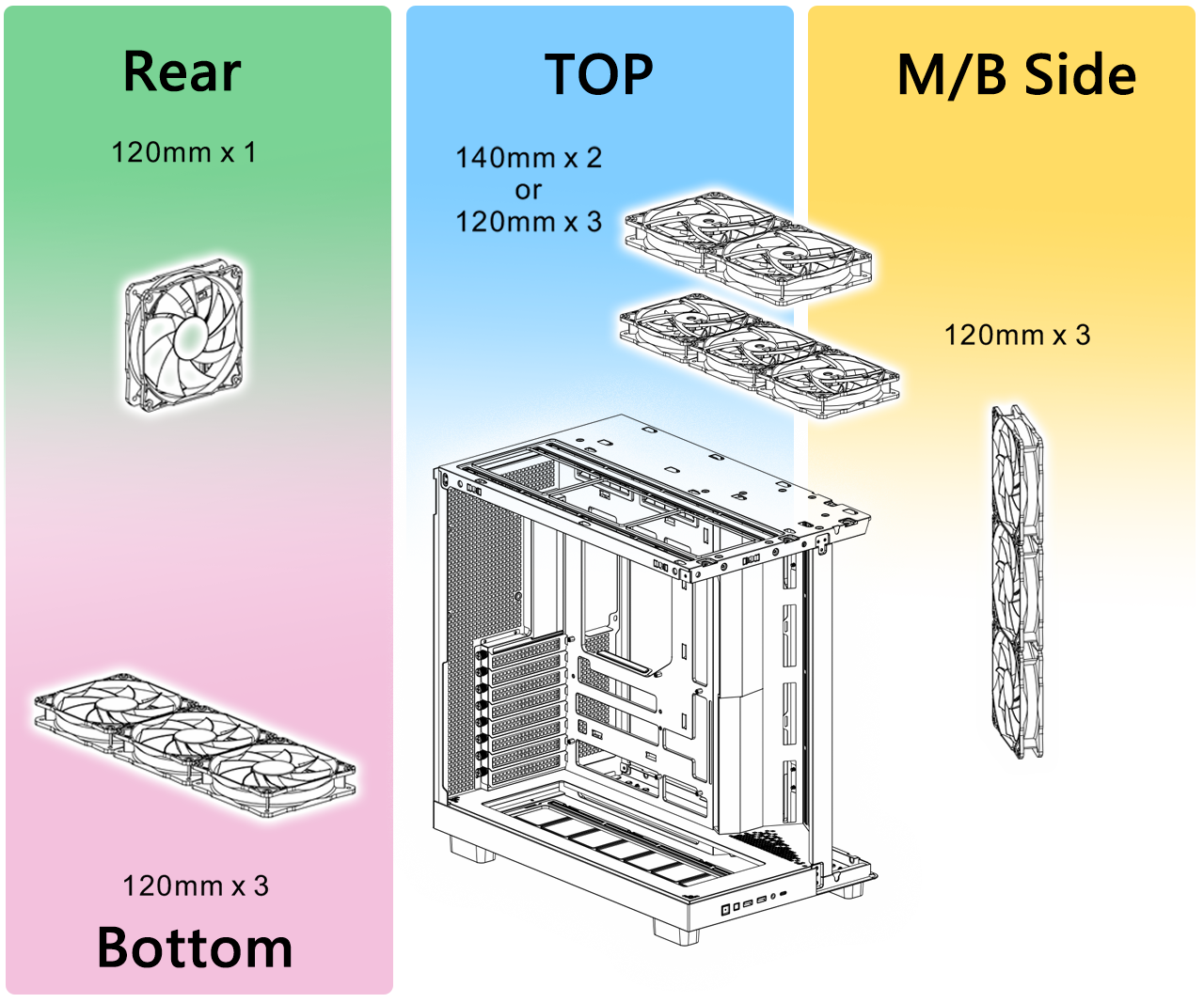 Cooling System | Right(intake): 120 x 120 x 25 mm ARGB Lite Reverse fan (1000rpm, 21.9 dBA) x 3 Rear(exhaust): 120 x 120 x 25 mm ARGB Lite fan (1000rpm, 22.3 dBA) x 1 |